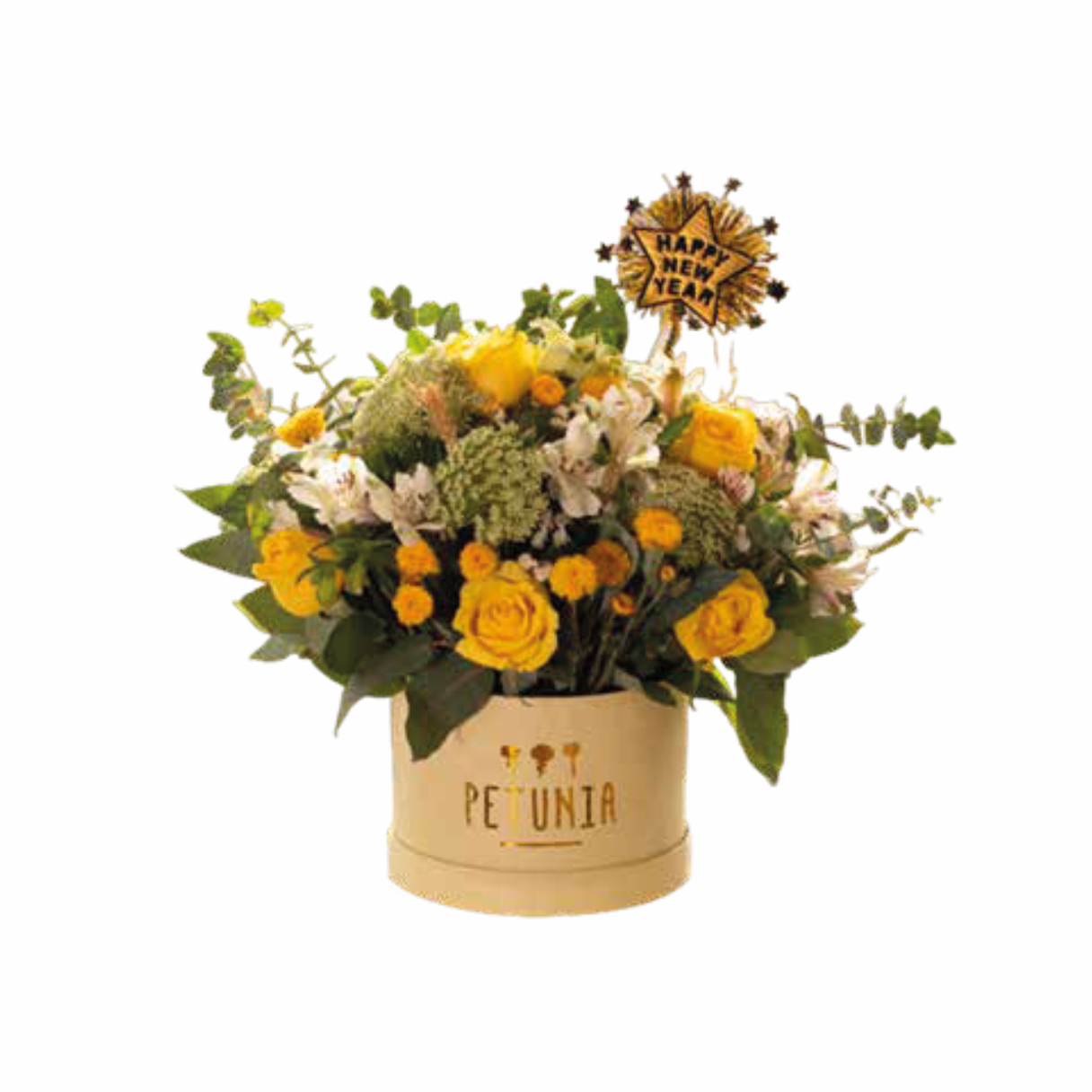 Mix de rosas, flores y follajes con decoración de año nuevo.