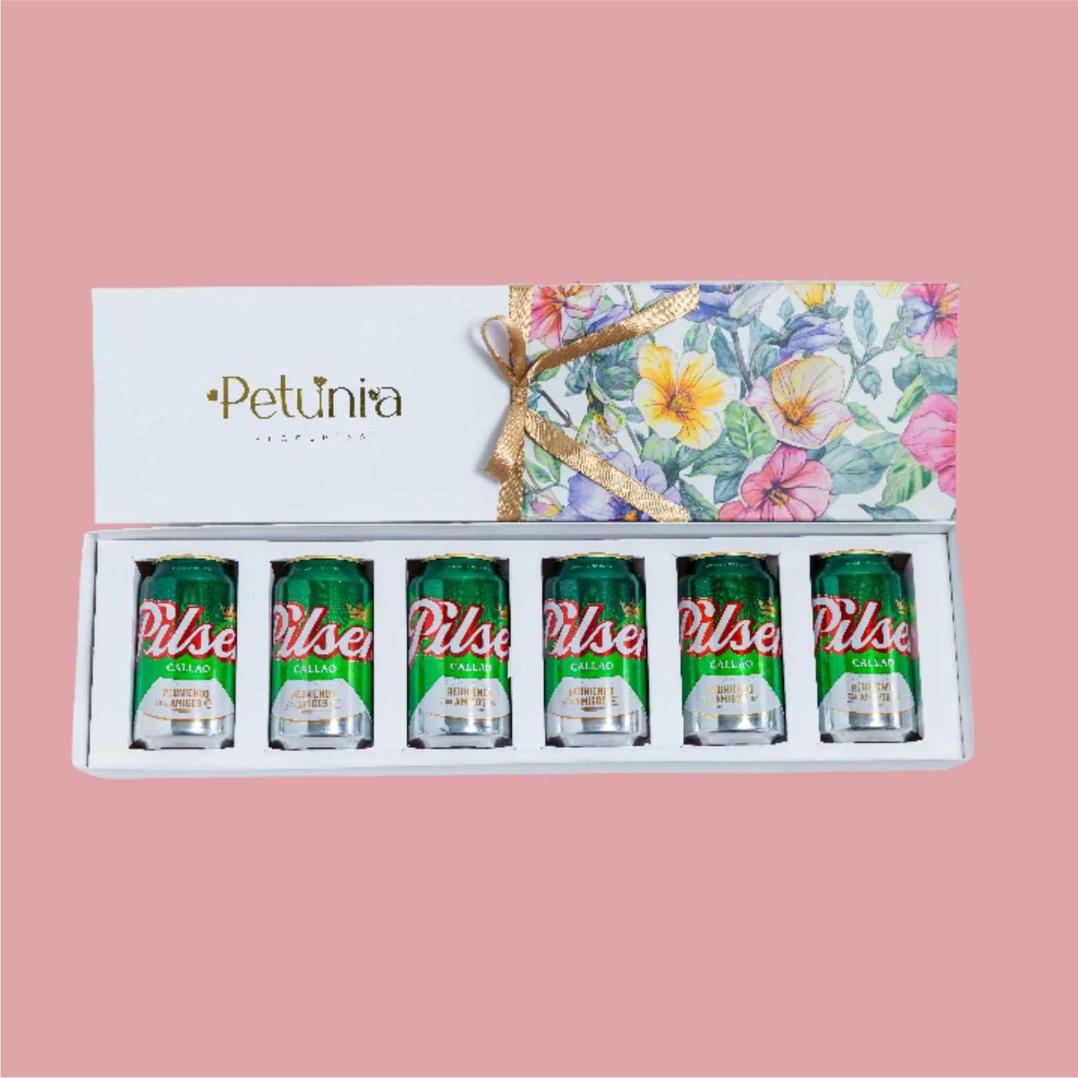 6 latas de cerveza pilsen de 355ml en caja de regalo.