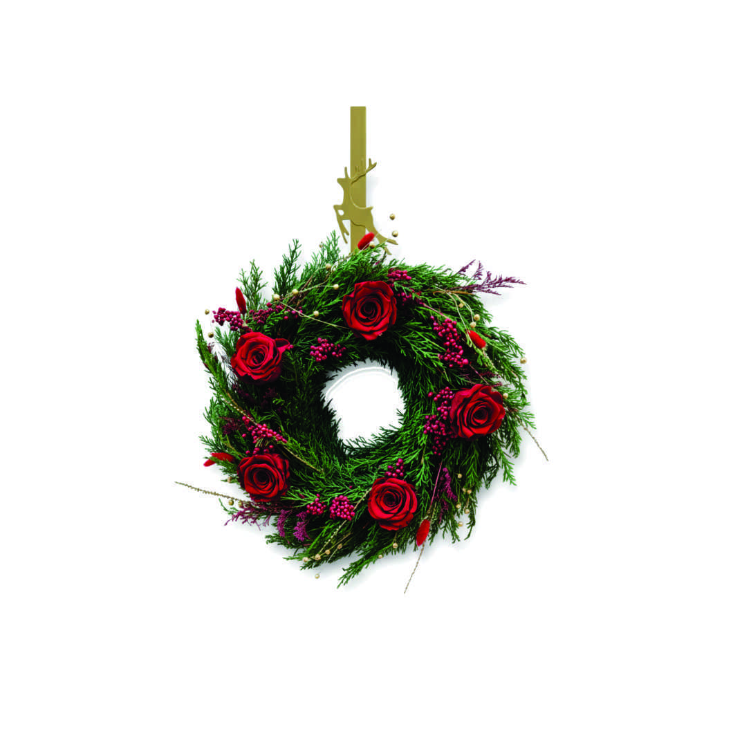 5 rosas preservadas, flores complementarias preservadas.