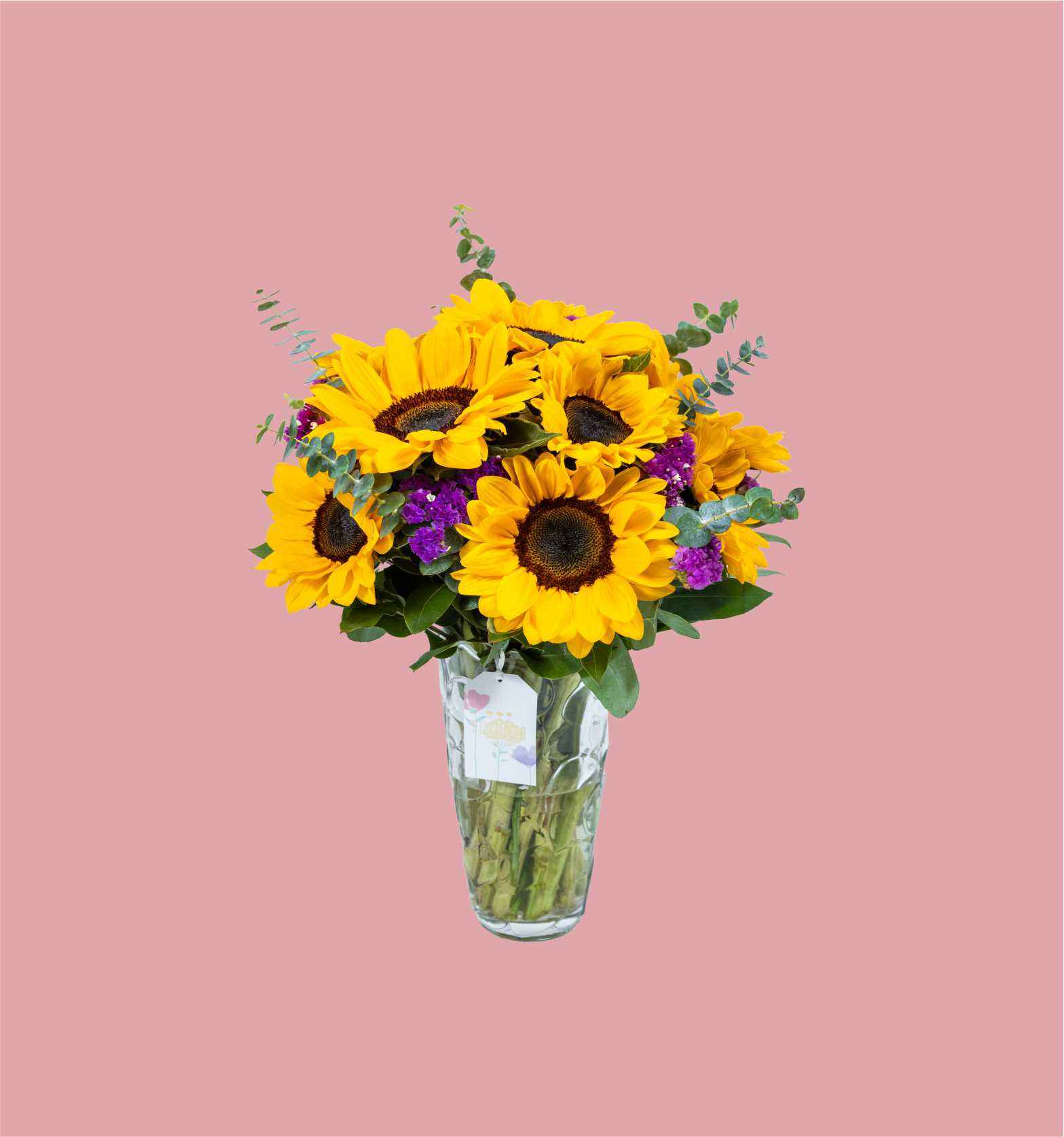 12 girasoles, flores complementarias y follaje en florero de vidrio.