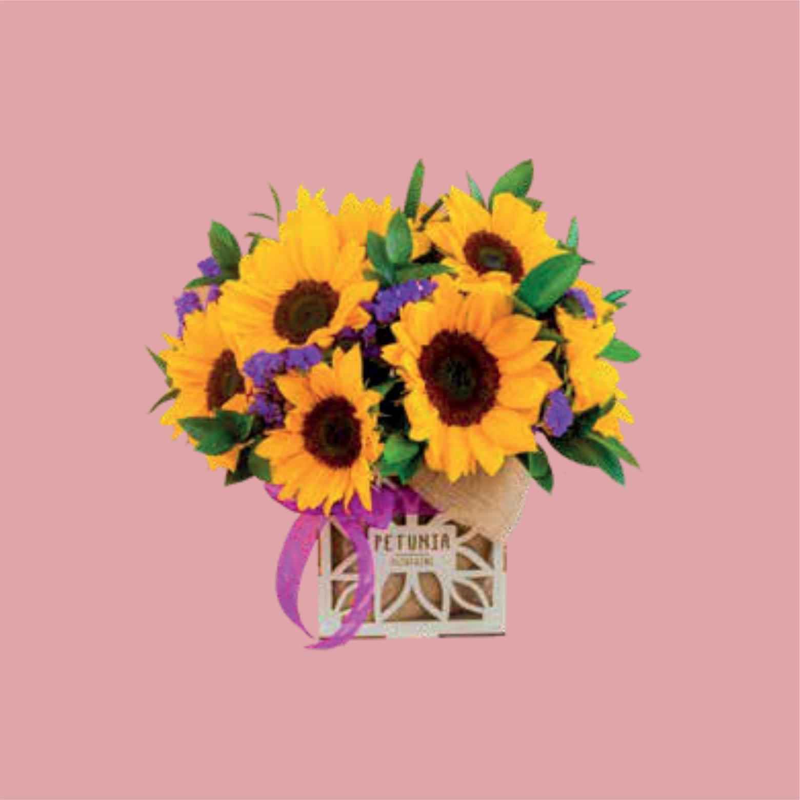 14 girasoles, flores complementarias y follaje en caja de imitación madera estilo vintage.